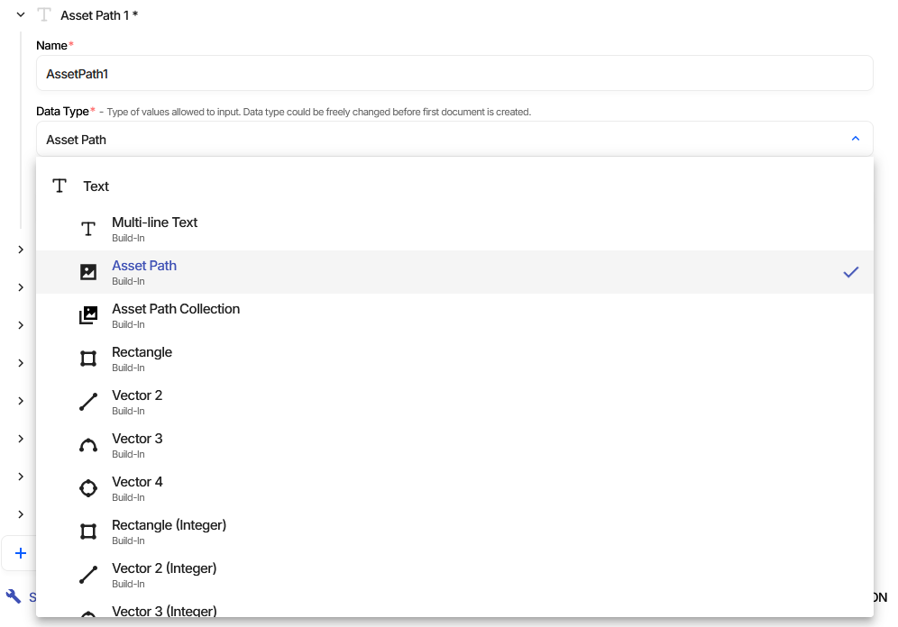To reference assets within the game, you can use a special sub-data type. Create a property with the Text type, enable the Advanced Options, and select the Asset Path editor for this property.